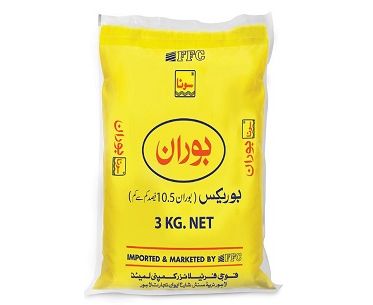Sona Boron is a micronutrient fertilizer in the form of Di-Sodium Tetra Borate Decahydrate in 3 Kg packing. It is an essential micronutrient required for plant nutrition, which plays a vital role in a number of growth processes especially new cell development, fruit/seed setting, translocation of sugars, starches, nitrogen and phosphorous, nodule formation in legumes and regulation of carbohydrate metabolism. Boron deficiency appears in youngest leaves as wrinkled, often thicker and of a darkish blue green color. As deficiency progresses, the terminal growing point dies and flowers & fruits formation is restricted or inhibited; fruits remain very small and of poor quality. Keeping in view increasing boron deficiency in Pakistan soils, FFC is providing superior quality Sona Boron containing 10.5% Boron (Borax). It is soluble in water and readily available to plants. It is used as soil application alone or by mixing with other fertilizers.