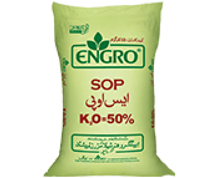 Sulphate of Potash (SOP) is chloride free/low chloride form of Potassium and is also applied as a straight fertilizer that provide choice to farmers for use as per need of specific crop Engro SOP is launched in 50kg SKU in both Granular and Powder forms, targeting all potash loving crops such as tobacco, potato, tomatoes, row crops, vegetables, fruits and orchards. SOP contains 50% Potassium nutrient (K2O) and 17.5% Sulphur (S). SOP is considered as a premium-quality potash for high value crops. Using SOP not only improves quality and crop yields, but also makes plants more resilient to drought, frost, insects and even disease attack.