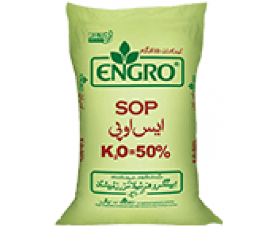 Sulphate of Potash (SOP) is chloride free/low chloride form of Potassium and is also applied as a straight fertilizer that provide choice to farmers for use as per need of specific crop Engro SOP is launched in 50kg SKU in both Granular and Powder forms, targeting all potash loving crops such as tobacco, potato, tomatoes, row crops, vegetables, fruits and orchards. SOP contains 50% Potassium nutrient (K2O) and 17.5% Sulphur (S). SOP is considered as a premium-quality potash for high value crops. Using SOP not only improves quality and crop yields, but also makes plants more resilient to drought, frost, insects and even disease attack.