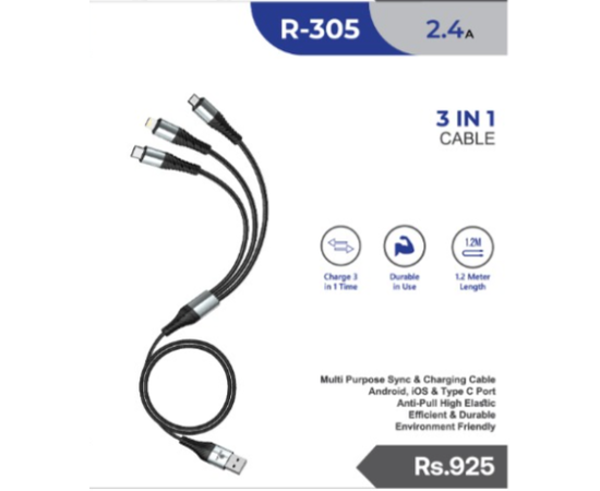 R-305 3 in 1 Durable Braided Cable – 1.2 Meter Length to work hassle-free while your phone charges, no need to pull the cables to check while working. Enjoy charge times up to 30 faster than most standard cables. Rapid charge and sync – Up to 2.4A max rapid charge depending on charging device, fast data transmission, and rapid speed to sync your device at the speed up to 480mbps Extremely Durable