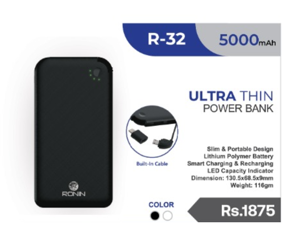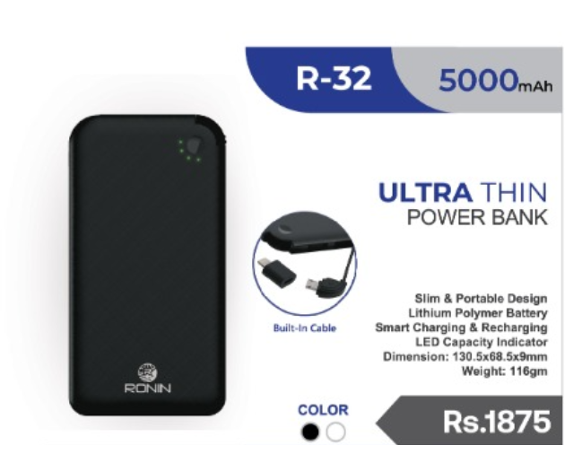 R-32 Ultra-Thin Portable 5000 mAh Power Bank is small but packs great power. This 5000 mAh can charge 2500-3000 mAh Devices almost 1.5 to 2 times.