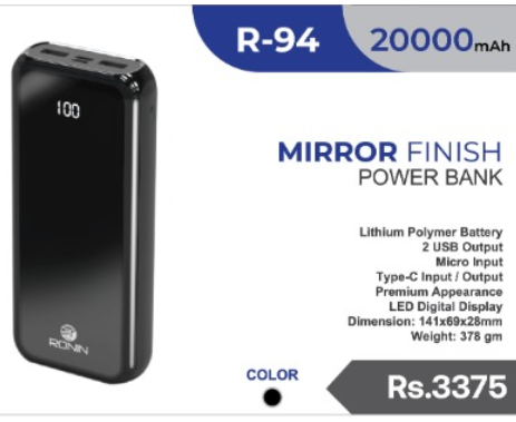 Our R-94 comes with a battery capacity of 20,000 mAh. While average battery capacity of mobiles is about 4500-5000 mAh. That means you can charge your phone around 3 times with once charged full power bank R-94.