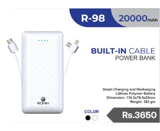 Ronin R-98 Built-In Cable 20000 mAh Power Bank is designed to provide an overall slim exterior with a greppable texture to go wherever you need to go.